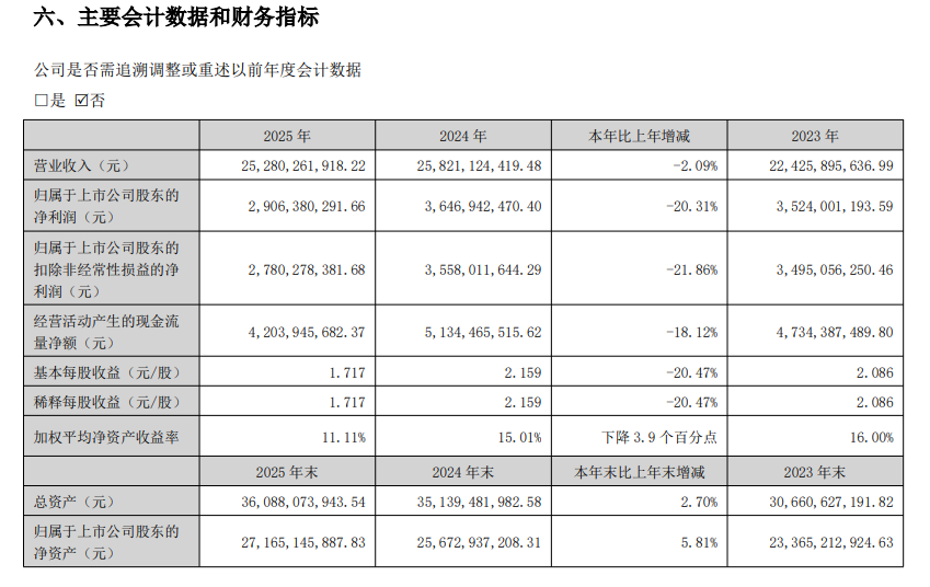 记者注意到,这份年报最直观的冲击来自利润端,2025年盈利、总利润、净利润均出现17%至20%不等的下滑。其中,归属于上市公司股东的扣除非经常性损益的纯利润是27.80亿元,同比下降21.86%,显示主营业务的盈利能力正在承压。
